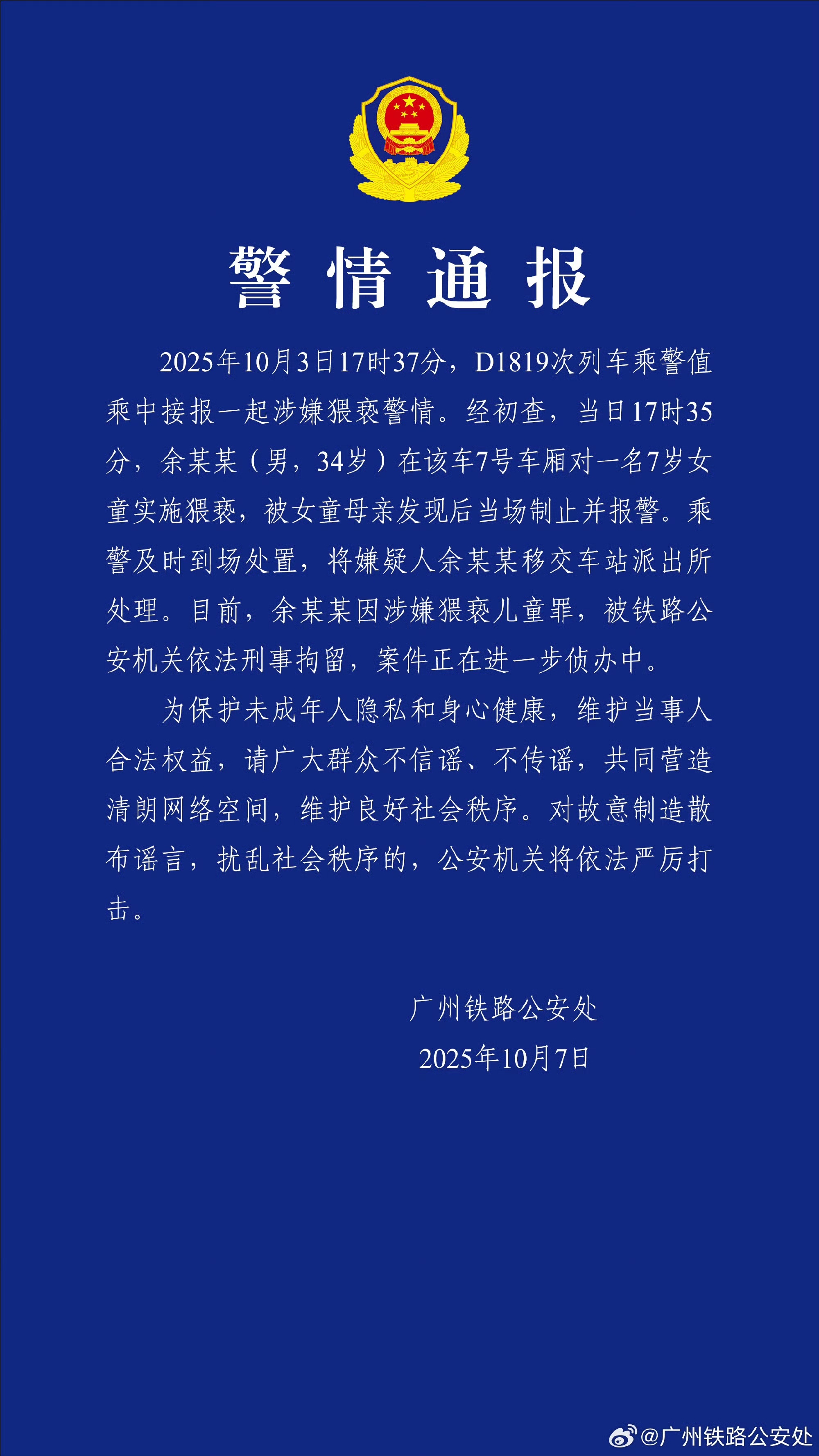 2025年10月3日17时37分,D1819次列车乘警值乘中接报一起涉嫌猥亵警情。经初查,当日17时35分,余某某(男,34岁)在该车7号车厢对一名7岁女童实施猥亵,被女童母亲发现后当场制止并报警。乘警及时到场处置,将嫌疑人余某某移交车站派出所处理。目前,余某某因涉嫌猥亵儿童罪,被铁路公安机关依法刑事拘留,案件正在进一步侦办中。